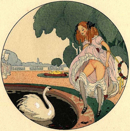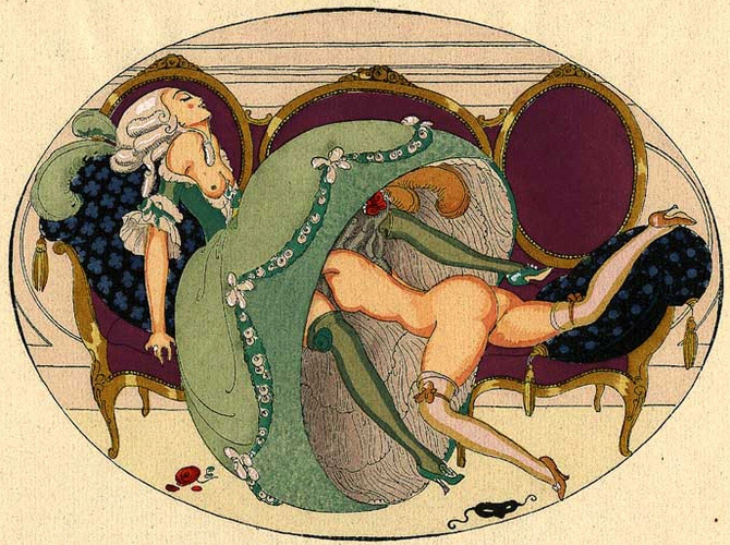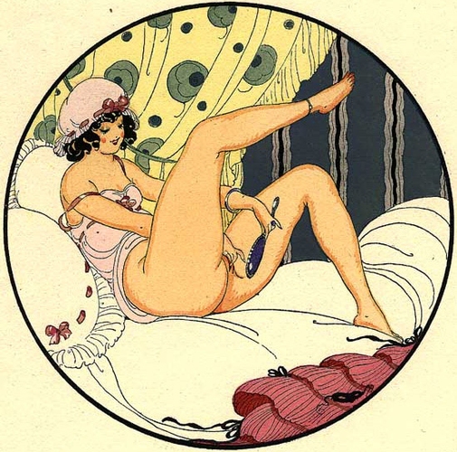 J’ai tout particulièrement craqué sur son travail cerclé ou ovalisé. Après quelques recherches, j’ai découvert que la plupart appartenaient à une série d’aquarelles intitulée Les Délassements d’Eros datant de 1917, qui fut republiée en 1925 accompagnée par douze sonnets lascifs signés Alexandre de Vérineau (Louis Perceau de son vrai nom). En voici l’intégralité après glanage aux quatre coins du net.