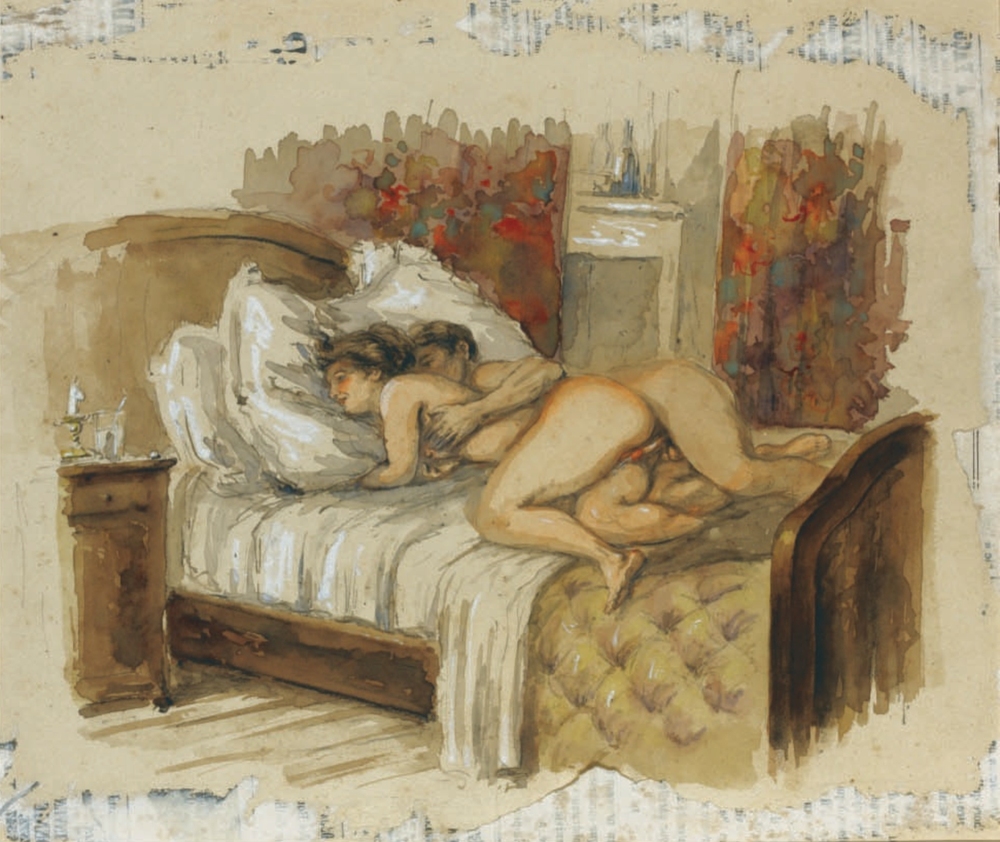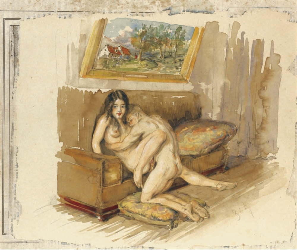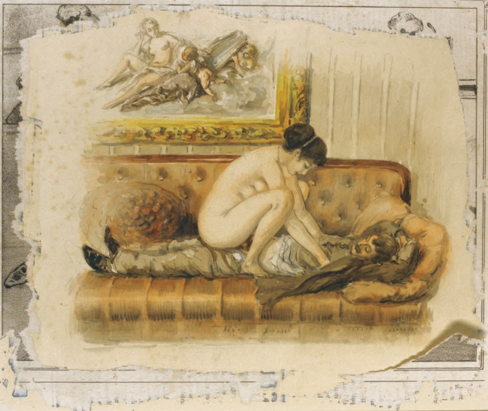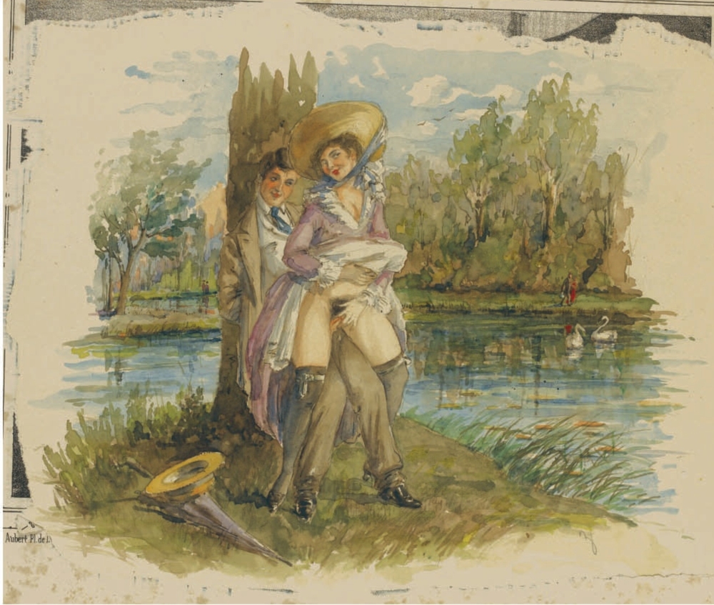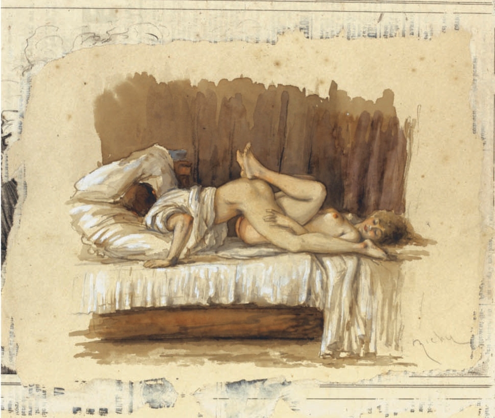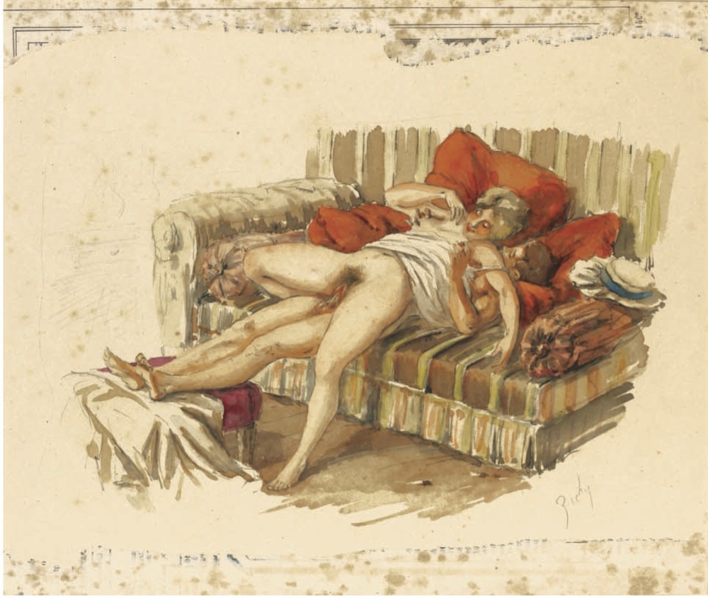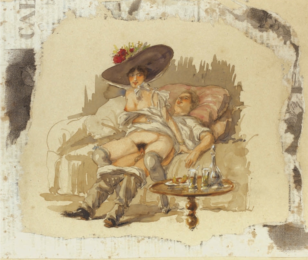 Au fil de mes recherches sur le net, je suis tombée sur cette série sur le site de Sotheby, qui ne se mouille pas trop sur son authenticité en parlant de « Cercle du Comte Mihály Zichy ». Le style est assez différent et il n’est en effet pas dit que toutes les planches soient de Mihály Zichy, même s’il y a une forme d’unité, notamment avec ce collage sur du carton qui serait peut-être le reste d’une astuce pour dissimuler ces images plus que scandaleuses pour l’époque. Certaines aquarelles sont signées, d’autres ne comportent qu’une initiale, d’autres encore rien du tout. Cette série intitulée Souvenirs de jeunesse date de quelque part entre 1874 et 1879, soit toujours la période à laquelle Mihály Zichy menait encore la vie parisienne. Olé olé.
