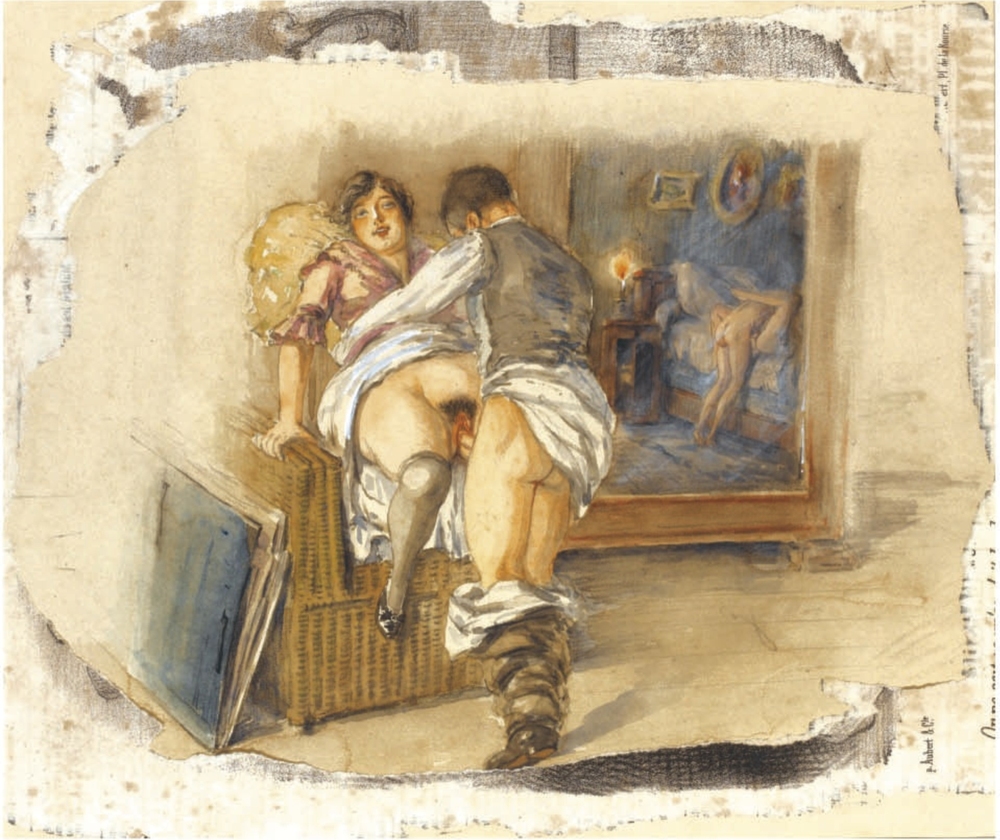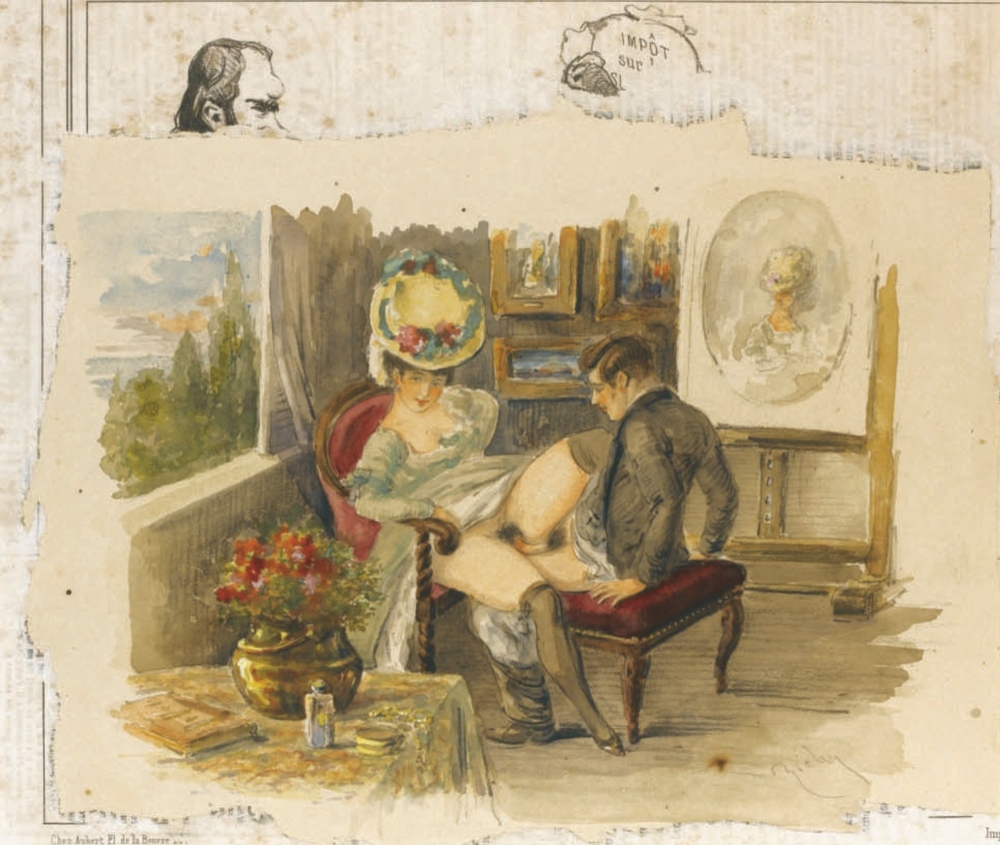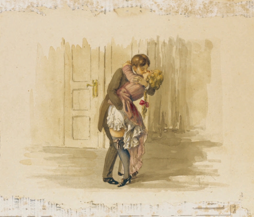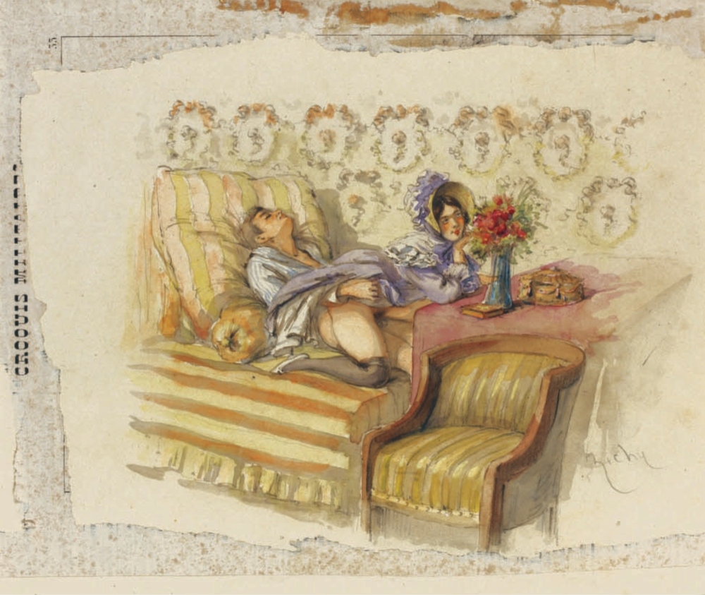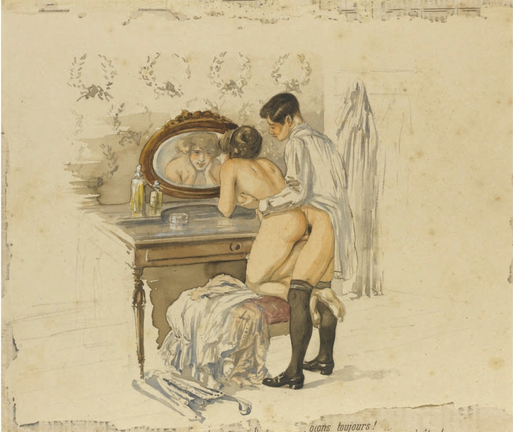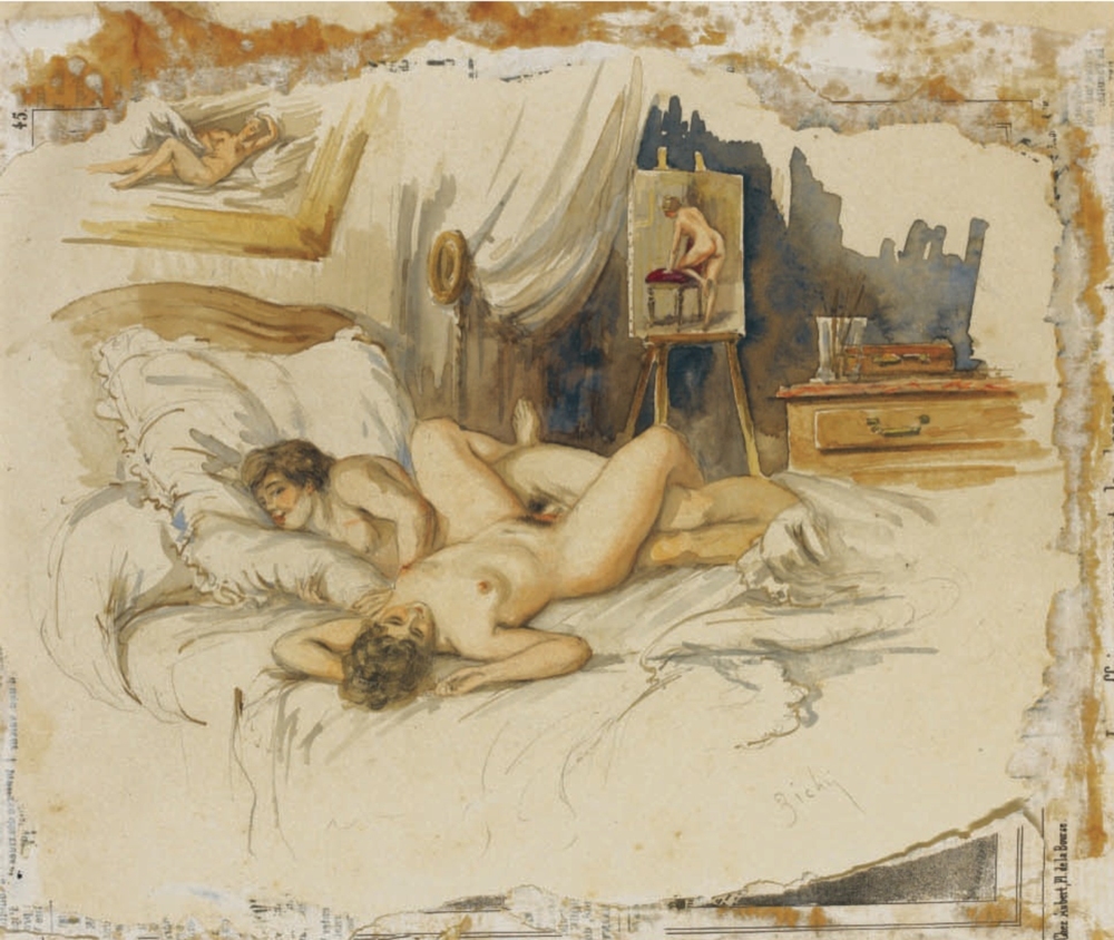Au fil de mes recherches sur le net, je suis tombée sur cette série sur le site de Sotheby, qui ne se mouille pas trop sur son authenticité en parlant de « Cercle du Comte Mihály Zichy ». Le style est assez différent et il n’est en effet pas dit que toutes les planches soient de Mihály Zichy, même s’il y a une forme d’unité, notamment avec ce collage sur du carton qui serait peut-être le reste d’une astuce pour dissimuler ces images plus que scandaleuses pour l’époque. Certaines aquarelles sont signées, d’autres ne comportent qu’une initiale, d’autres encore rien du tout. Cette série intitulée Souvenirs de jeunesse date de quelque part entre 1874 et 1879, soit toujours la période à laquelle Mihály Zichy menait encore la vie parisienne. Olé olé.