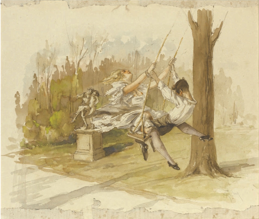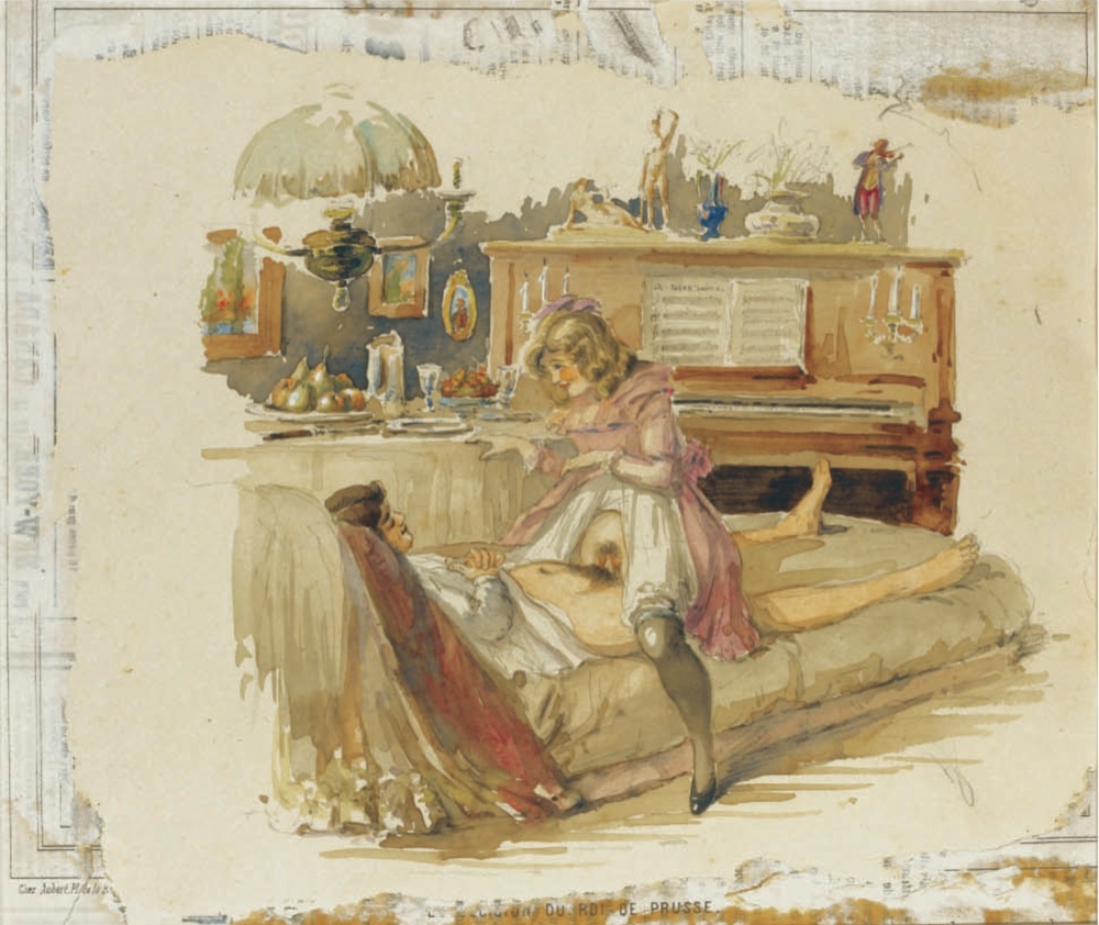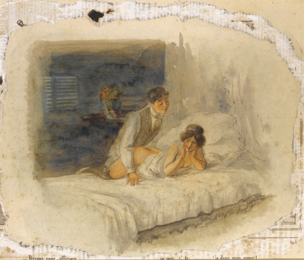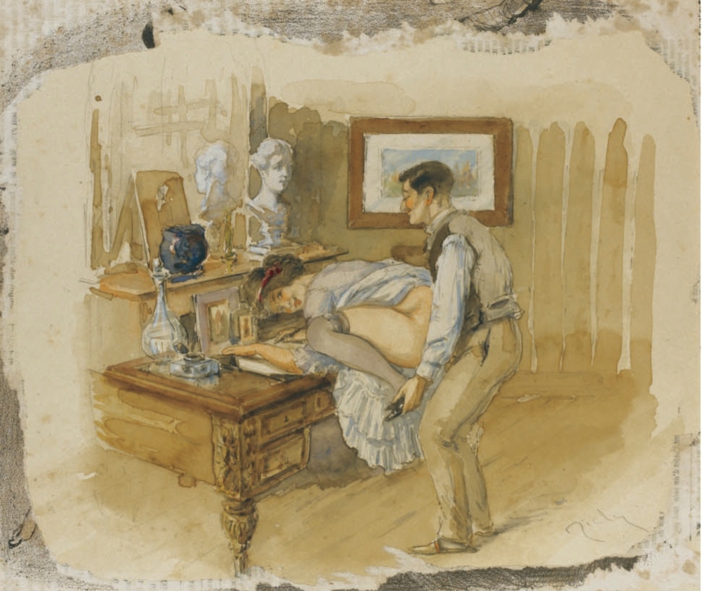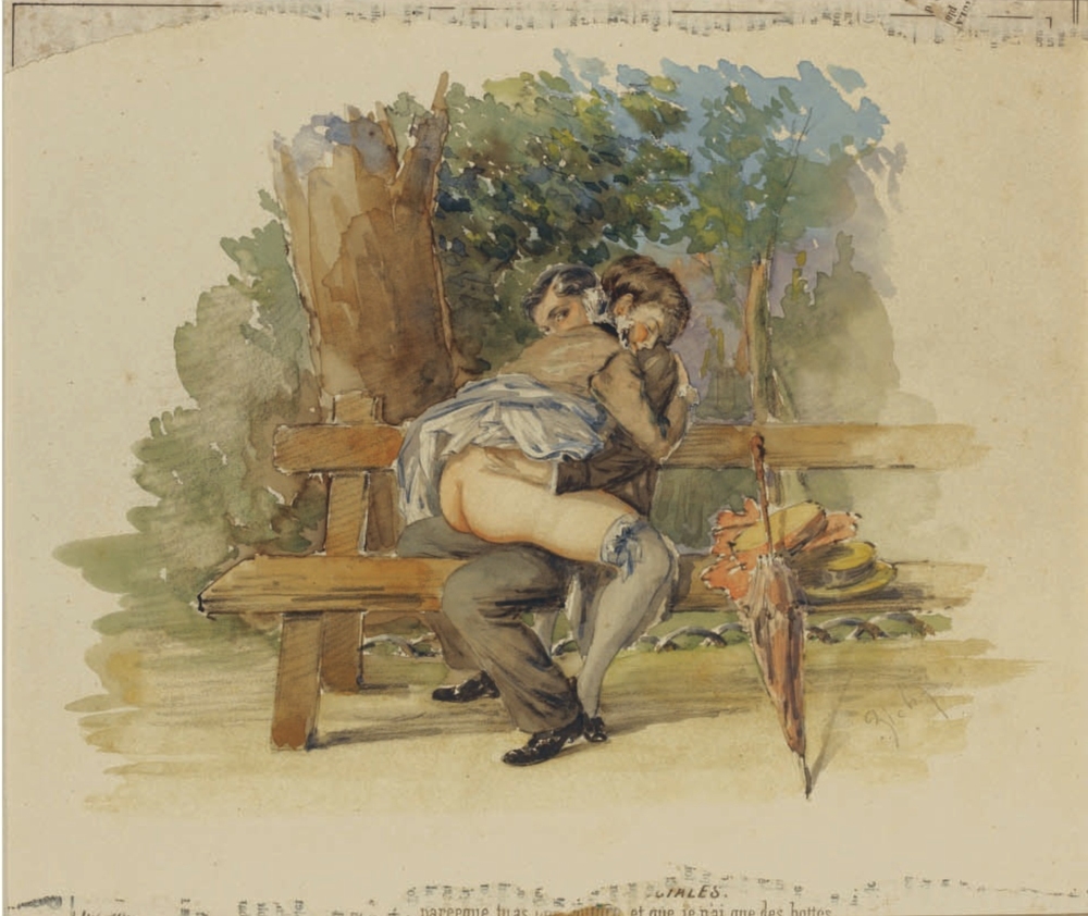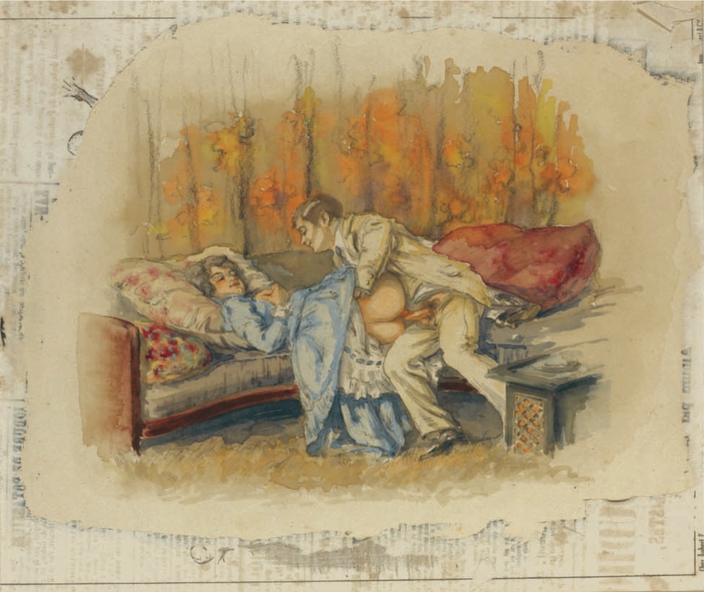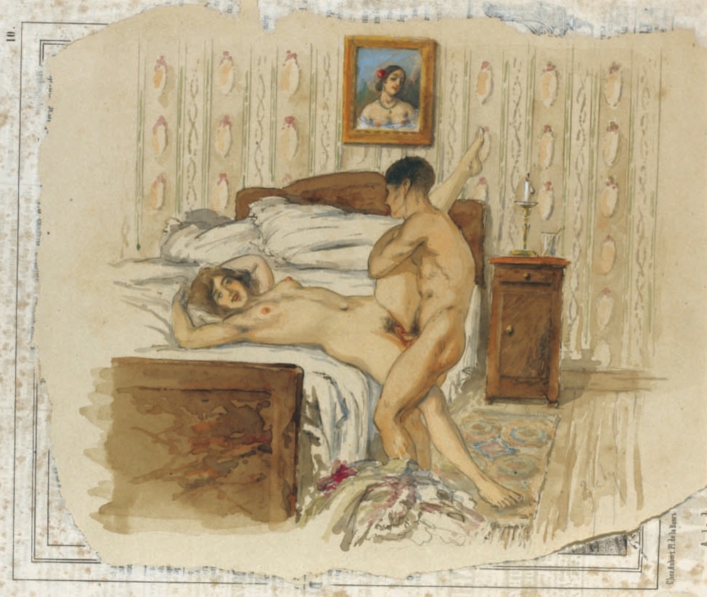 Au fil de mes recherches sur le net, je suis tombée sur cette série sur le site de Sotheby, qui ne se mouille pas trop sur son authenticité en parlant de « Cercle du Comte Mihály Zichy ». Le style est assez différent et il n’est en effet pas dit que toutes les planches soient de Mihály Zichy, même s’il y a une forme d’unité, notamment avec ce collage sur du carton qui serait peut-être le reste d’une astuce pour dissimuler ces images plus que scandaleuses pour l’époque. Certaines aquarelles sont signées, d’autres ne comportent qu’une initiale, d’autres encore rien du tout. Cette série intitulée Souvenirs de jeunesse date de quelque part entre 1874 et 1879, soit toujours la période à laquelle Mihály Zichy menait encore la vie parisienne. Olé olé.