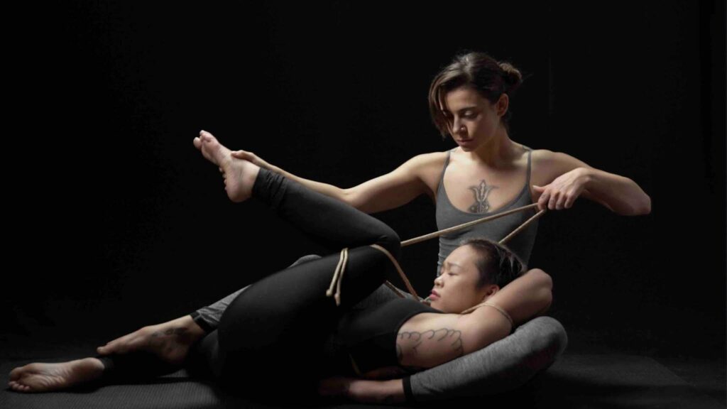 En tant qu’encordeuse, je me suis sentie plus libre dans le sens où j’avais moins à réfléchir à mes figures. Mon énergie était investie dans le mouvement, dans la tension de la corde, dans le changement de rythme et dans le rapport à l’autre corps qui devient presque un poids mort. Il s’agit de le manipuler comme s’il s’agissait d’un pantin avec l’idée de lui faire perdre ses repères pour l’aider à se laisser aller complètement. Bien sûr, comme je suis très intime avec mon partenaire, c’était d’autant plus fort. J’ai adoré pouvoir ressentir aussi fortement la connexion entre nous et j’ai adoré faire vivre ce beau moment de lâcher-prise à mon encordé. J’ai bien compris qu’il y reviendrait à l’occasion et ce sera avec beaucoup de plaisir pour moi aussi.